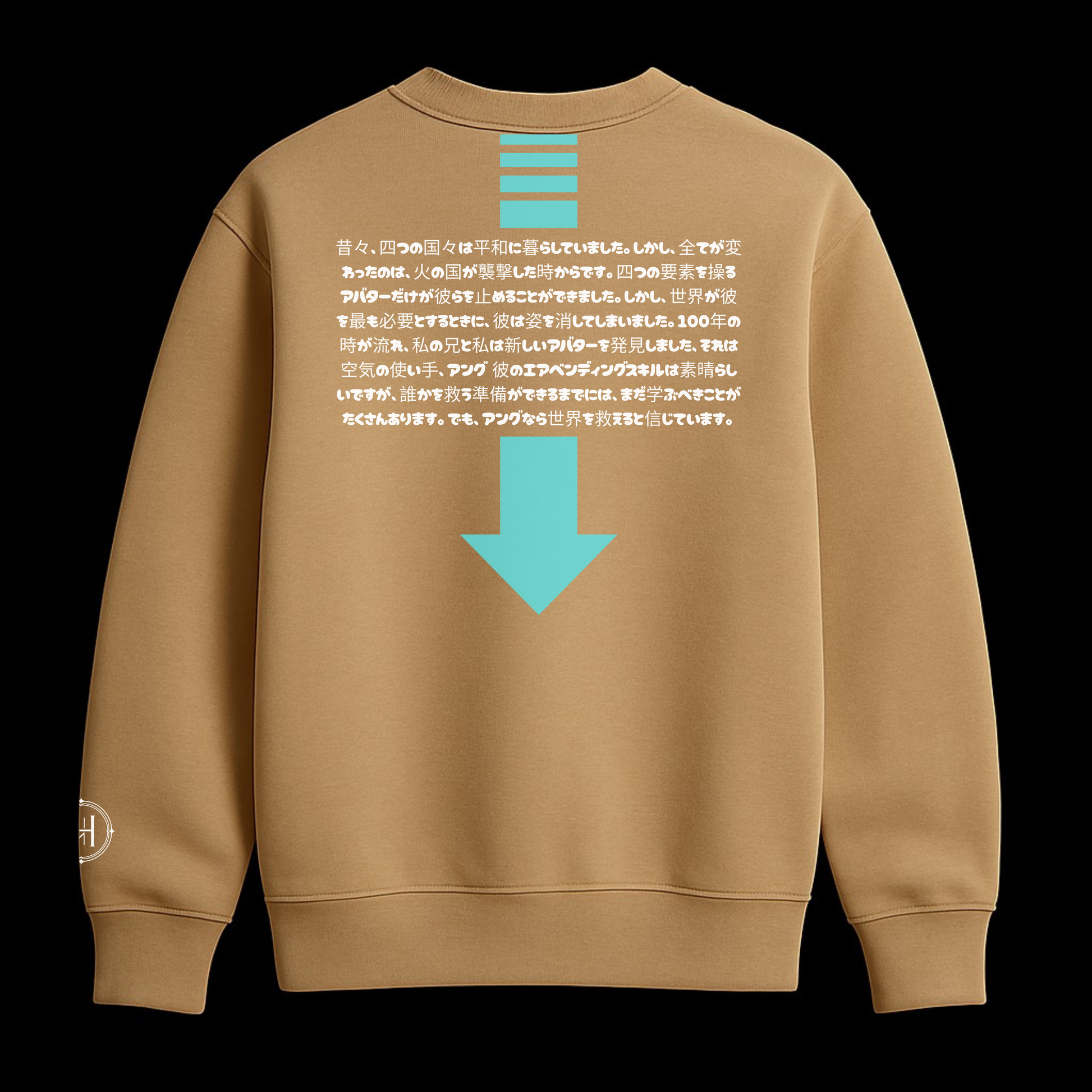 The Spiritline Edition crewneck is a Kaizen Kulture elevation on minimalism and lore. On the front, the glowing arrow and glyphs mark the airbending roots of the Avatar, On the back, the tale unfolds, written in Japanese, telling the origin of the Avatar, passed through lifetimes.